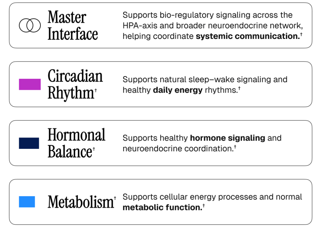 HOLOGRAMโข works at a deeper level by supporting the neuroendocrine system โ the bodyโs core regulatory network that helps maintain overall vitality and stability across the body. This system coordinates how the body adapts, regulates itself, and maintains internal balance, making it foundational to whole-body function โ a level of influence conventional supplements simply do not reach.โ