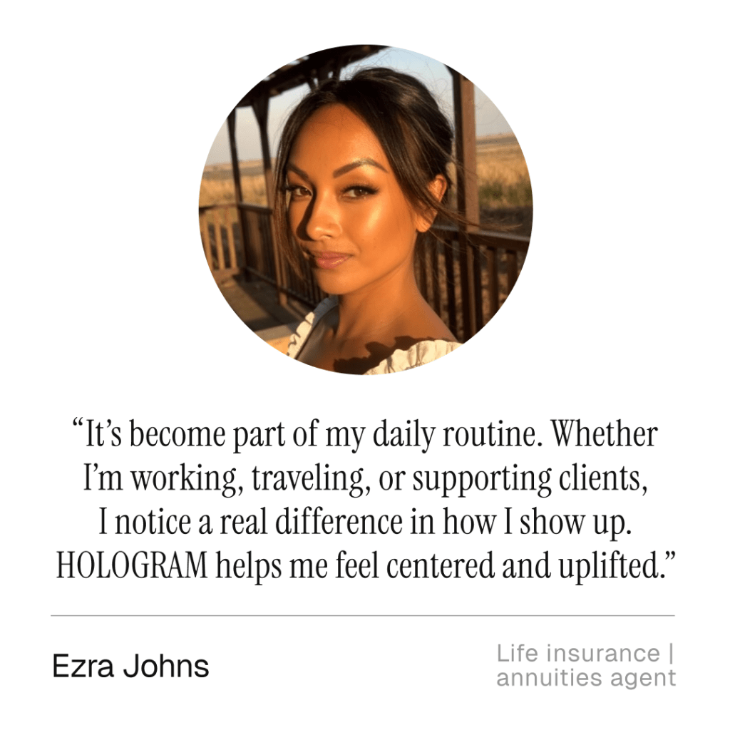 Early effects are often noticeable within the first week, commonly beginning with improved sleep quality, morning energy, recovery, or a greater sense of well-being. Because HOLOGRAMโข works at the bodyโs regulatory foundation, these early changes often precede broader benefits that build with continued use, including improvements in resilience, physical performance, and body composition.โ